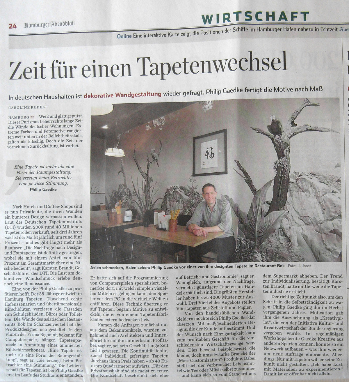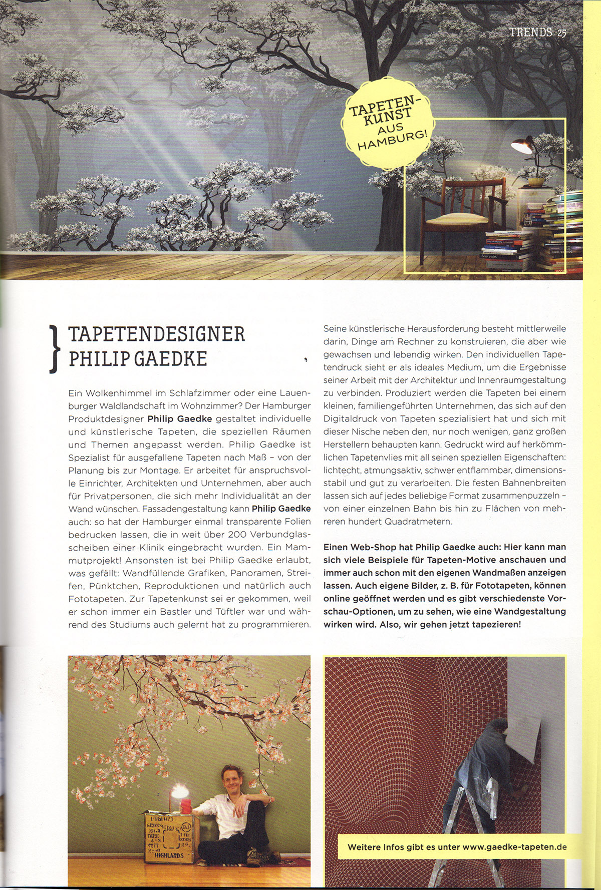 "... Philip Gaedke druckt Tapeten mit neuen Techniken. Sie ermöglichen ganz neue Motive. Statt klassischer Rapporte stehen so genannte "freie" Rapporte zur Wahl. Eintönige Wiederholungen von Bahn zu Bahn sind damit obsolet. ..."